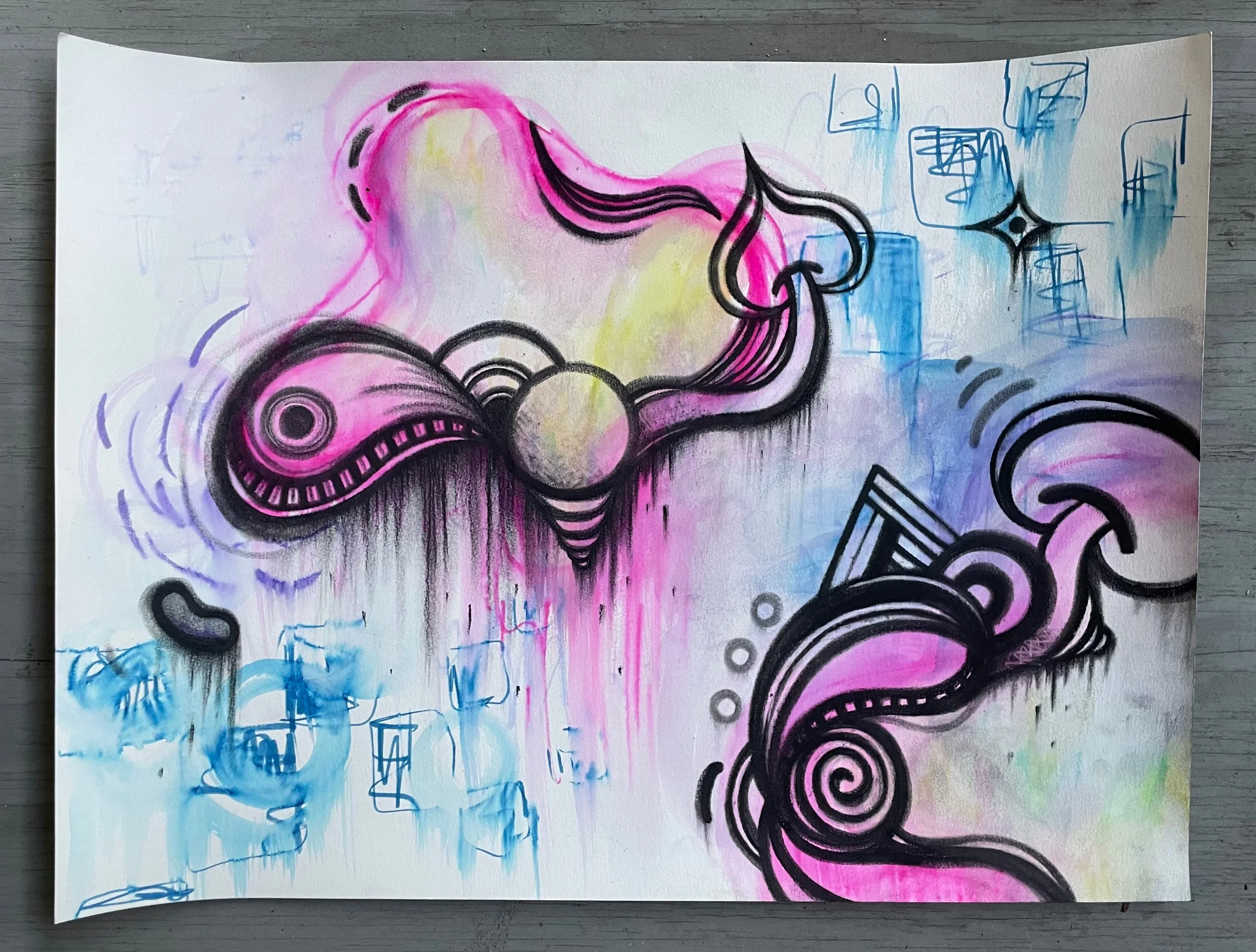 Made 2025. Acrylic paint and ink on watercolor paper. 18x24 inches.