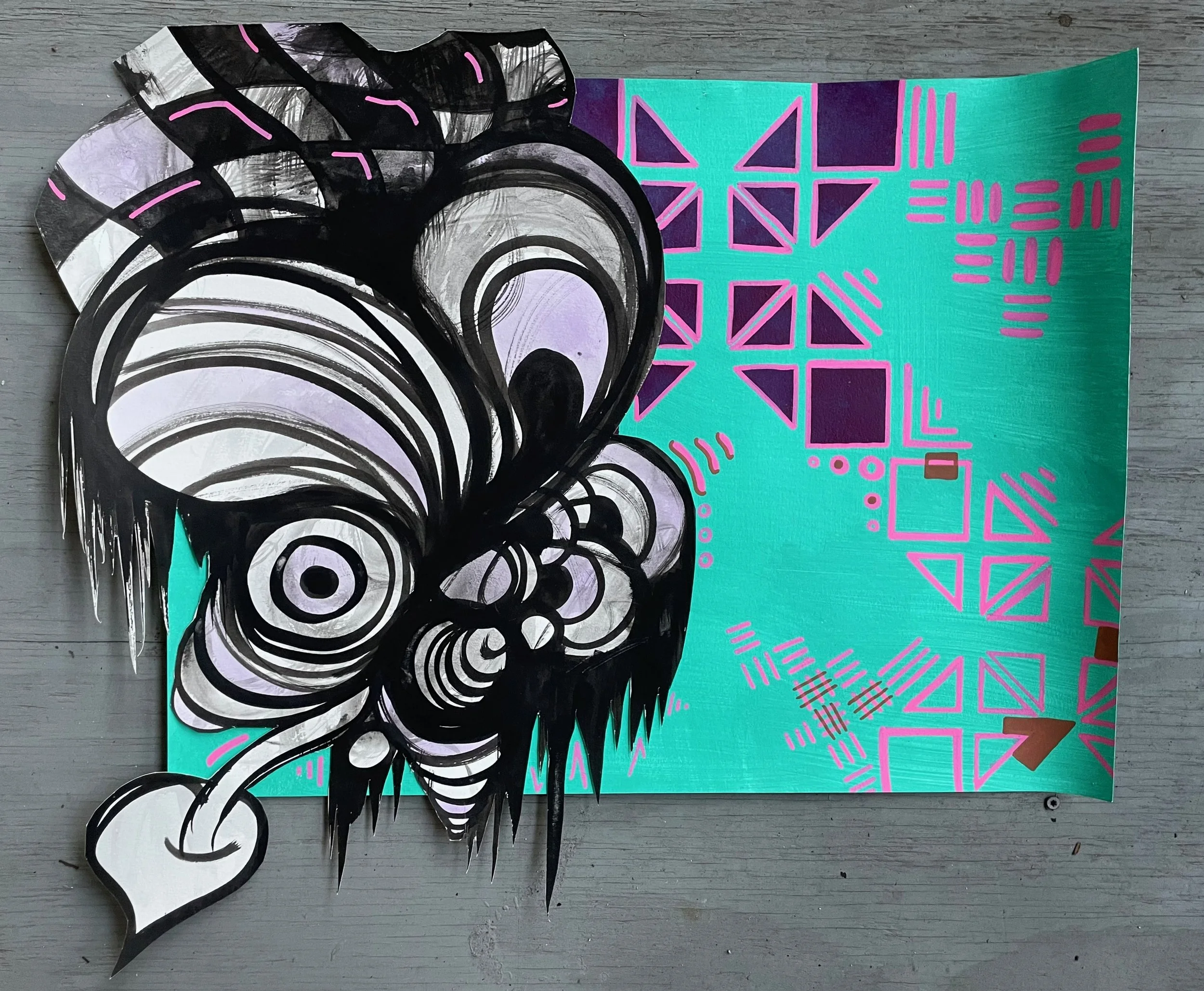 Made 2025. Acrylic paint, ink, scissors, glue, and stencil on watercolor paper. 22x28 inches.