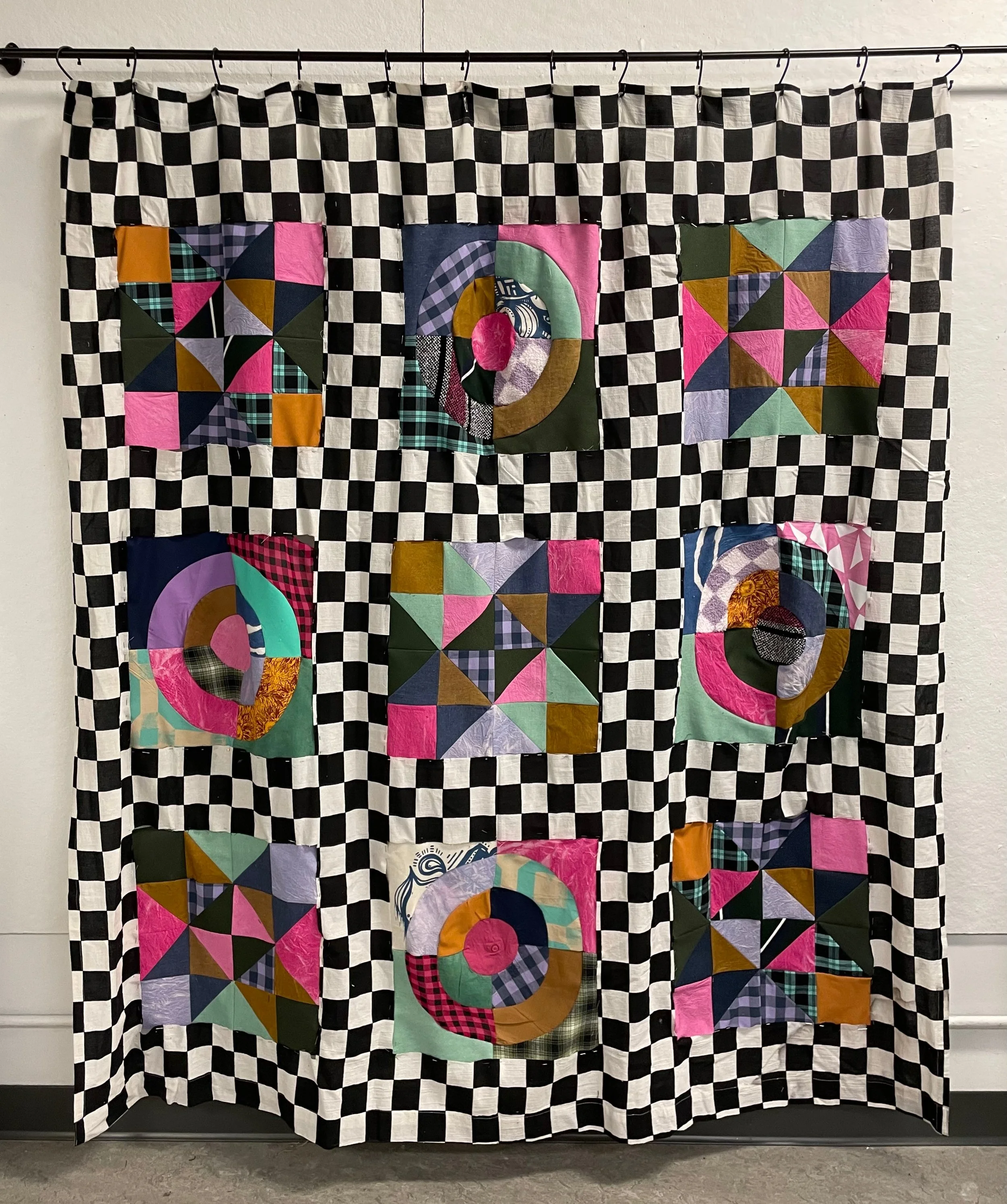 “Collaged Curtain”. Made 2024. Shower curtain, scrap fabrics, old clothing, and thread. 6x6 feet.