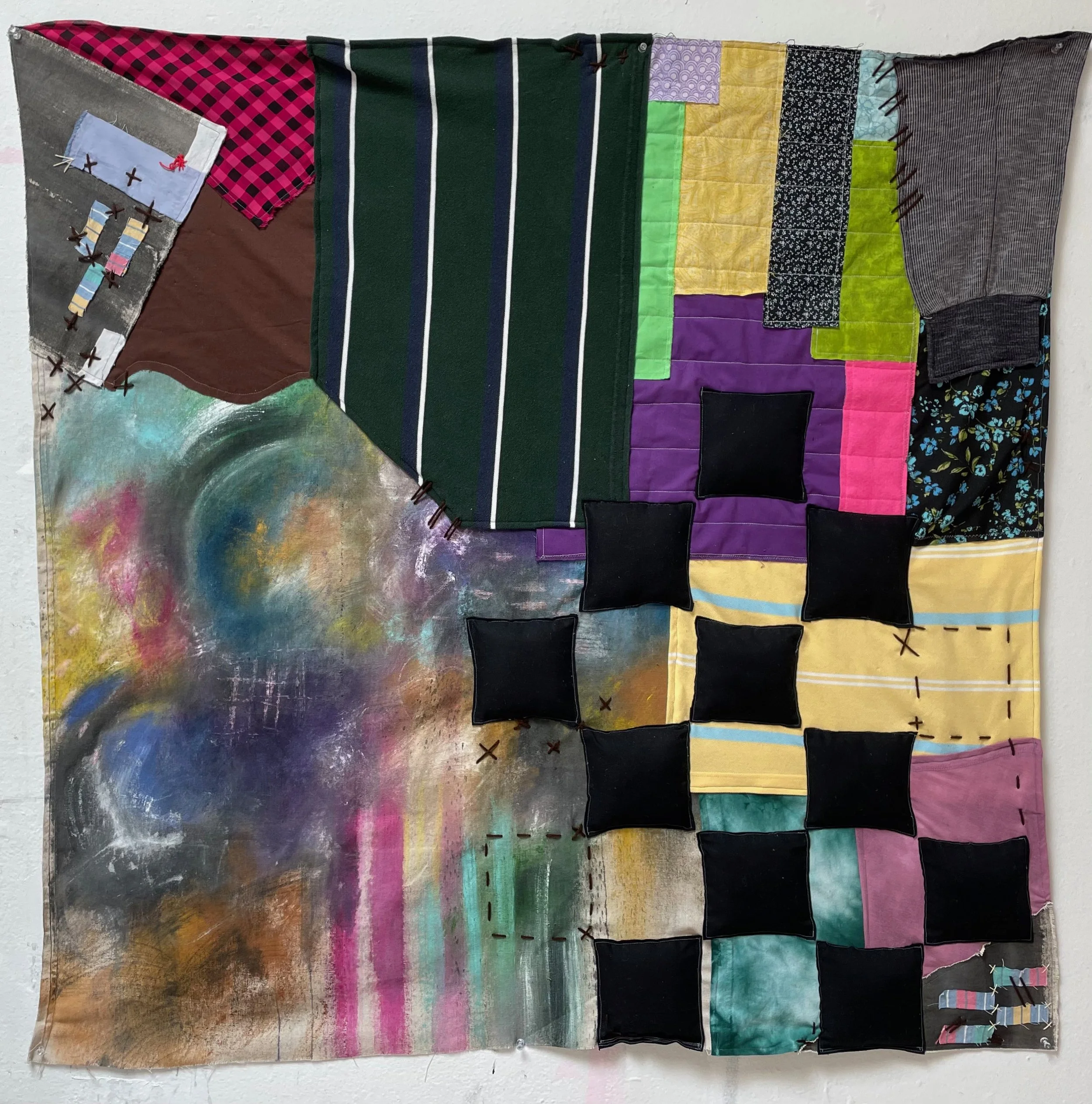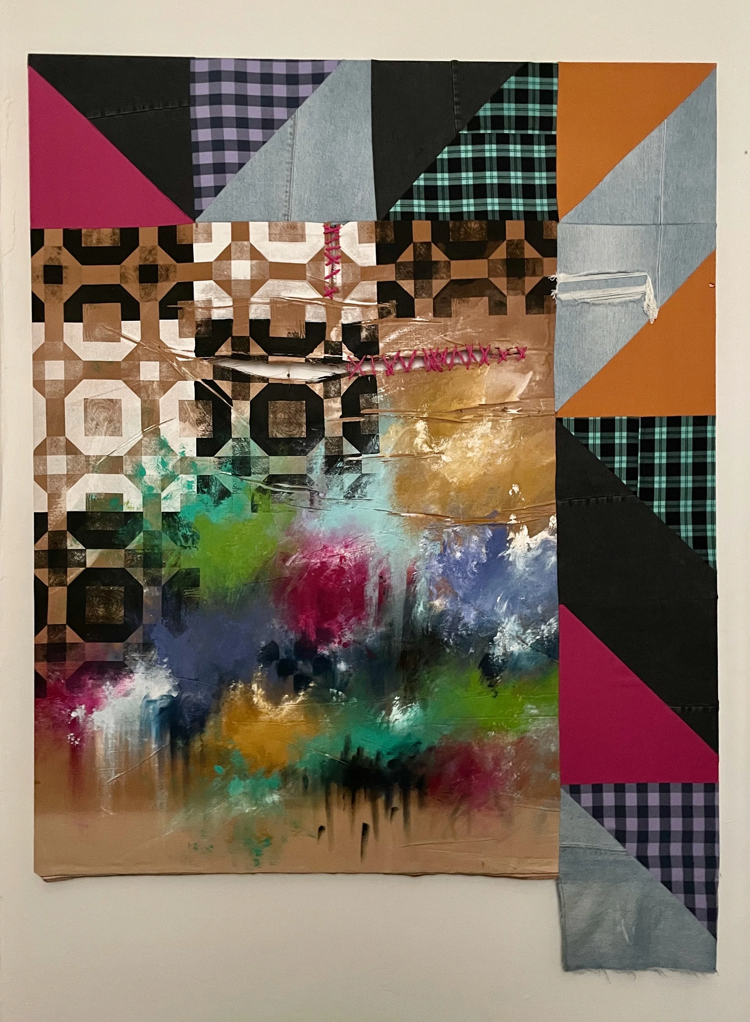 “Quilt Collage 2”. Made 2023. Found canvas, old clothing, acrylic paint, thread, yarn, and stretcher bars. 52x44x1.25 inches.