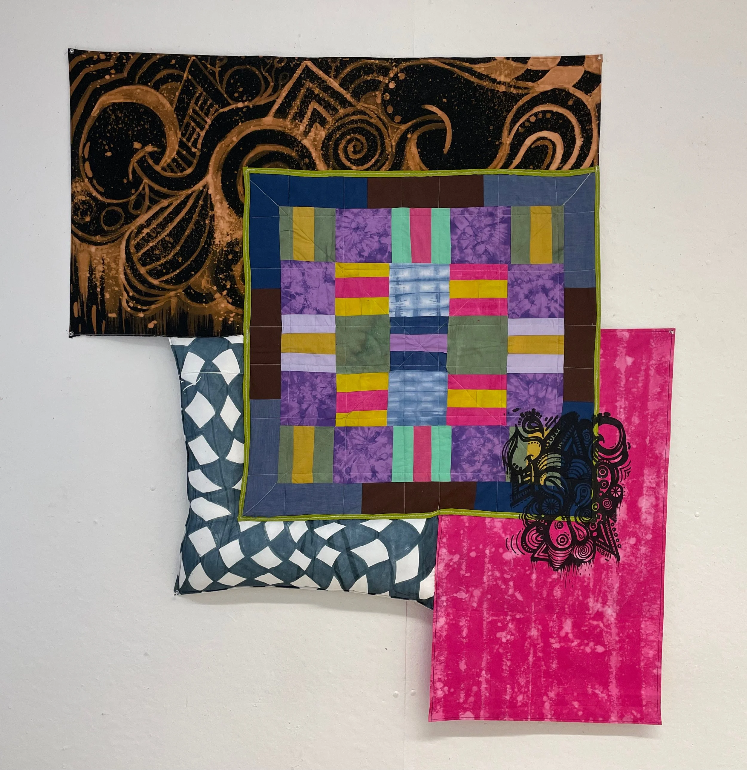 “Quilt Collage”. Made 2023. Small quilt, heat transferable ink, screen print ink, cotton fabric, bleach, MX dye, pillow stuffing, and thread. 57x53x4 inches.