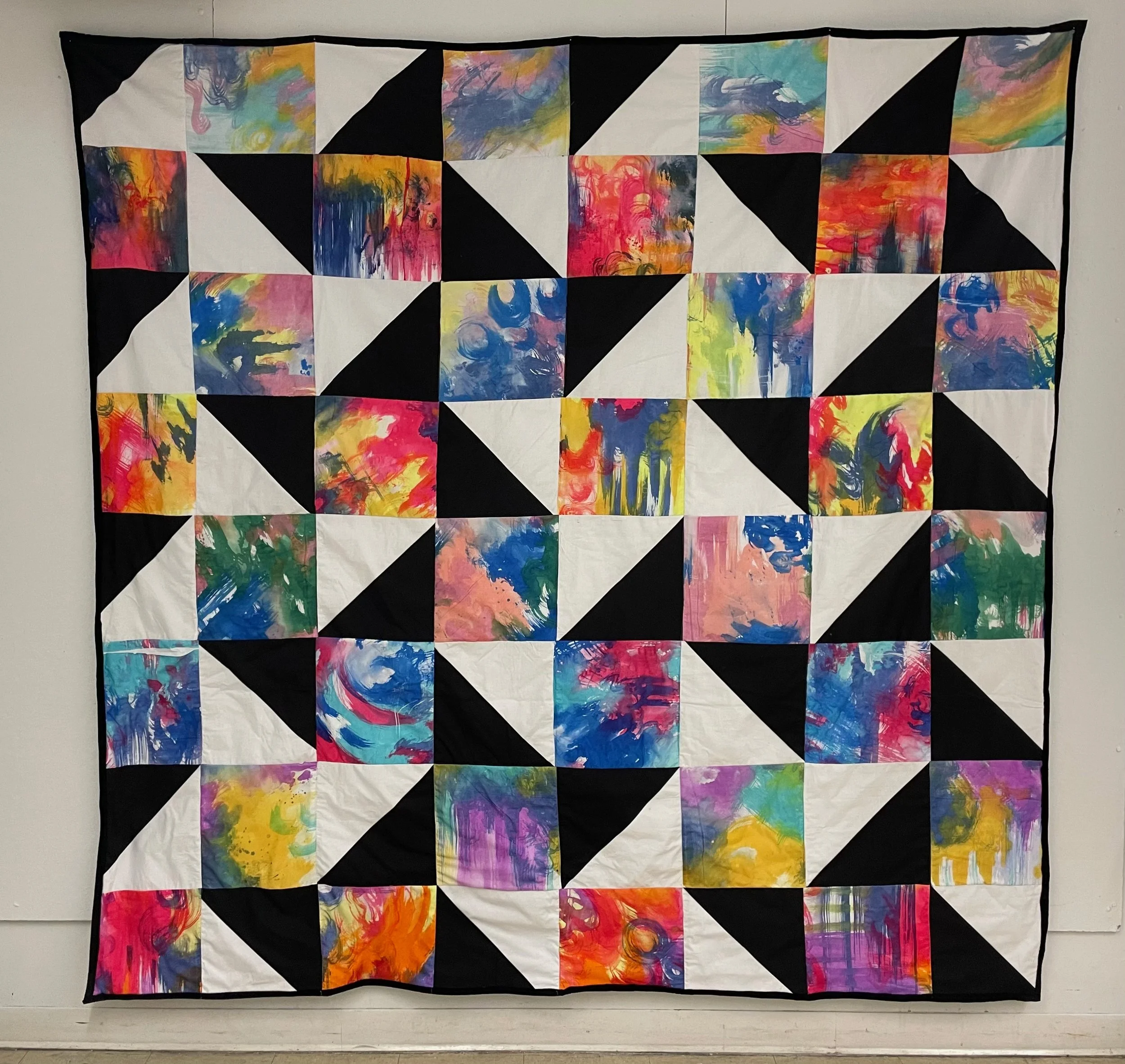 “Gen Z Quilt”. Made 2023. Cotton fabric, polyester fabric, fleece, heat transferable inks, and thread. 8x8 feet.